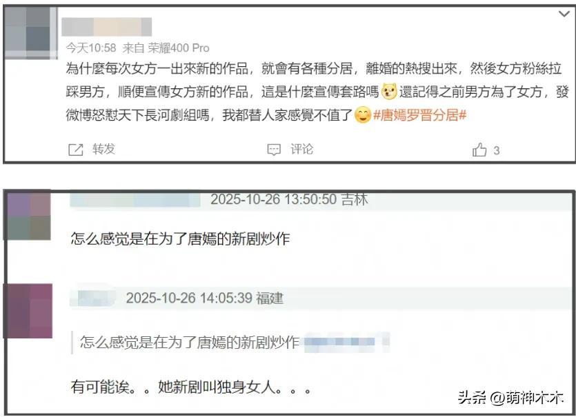 另外,不得不提的是,唐嫣的新剧可能要上了,剧名就是《爱情没有神话》,改编自亦舒小说《独身女人》,隐隐约约和分居风波对应上了,已经有网友忍不住怀疑,折腾上了好几个热搜,是不是为了新剧预热炒作呢?