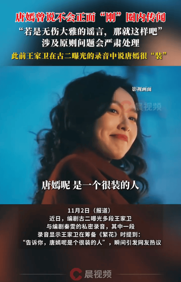 11月2日,据媒体报道,编剧古二在网络上公开多段疑似王家卫与编剧秦雯的私人对话录音,迅速引发舆论关注。其中一段涉及电视剧《繁花》筹备期的内容中,王家卫在交谈中称“告诉你,唐嫣呢是个很装的人”,该片段随即在社交平台广泛传播,成为热议焦点。