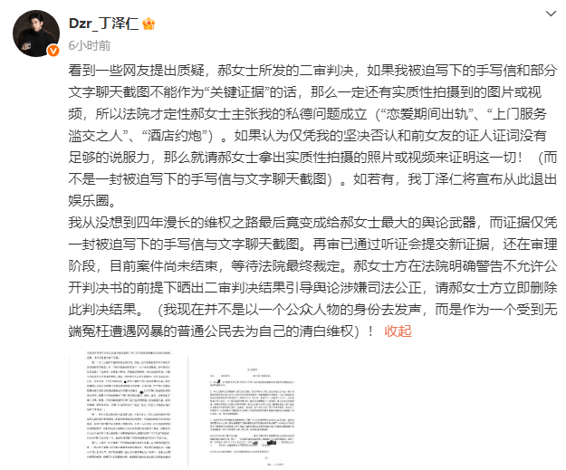 丁泽仁进一步表态:“如果认为仅凭我的坚决否认和前女友的证人证词没有足够的说服力,那么就请郝女士拿出实质性拍摄的照片或视频来证明这一切!(而不是一封被迫写下的手写信与文字聊天截图)。如若有,我丁泽仁将宣布从此退出娱乐圈。”