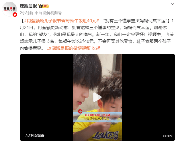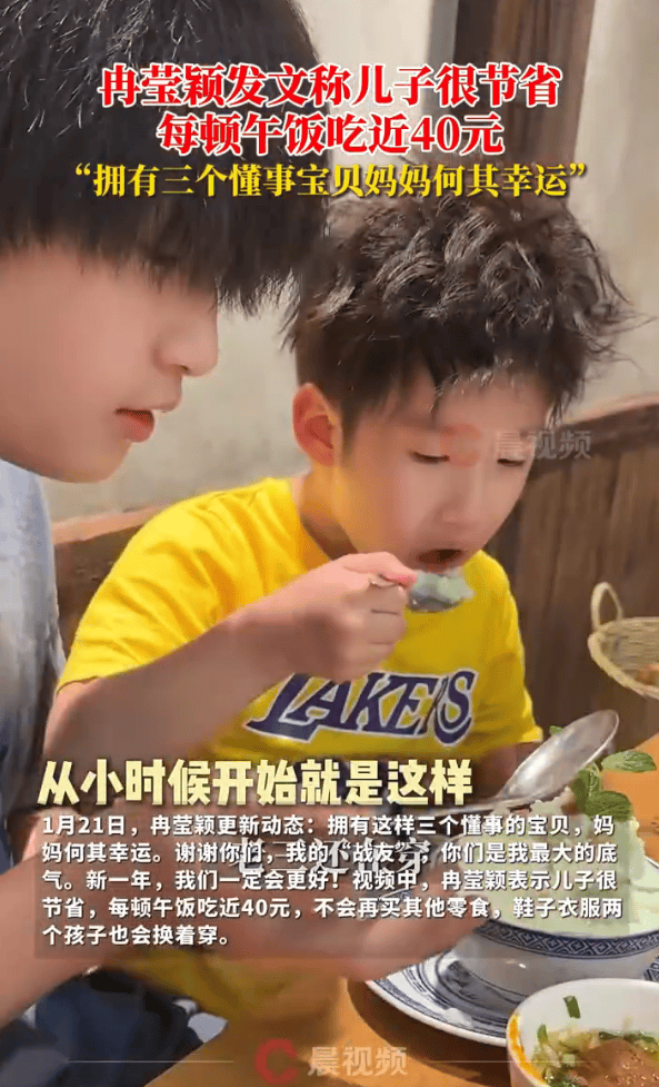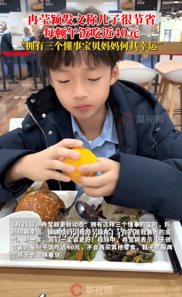 1月21日,冉莹颖在社交平台分享了孩子的日常消费习惯,儿子在午餐方面相当节省,每顿饭花费控制在40元左右,并且不会另外购买零食。她发文感慨:“拥有这样三个懂事的宝贝,妈妈何其幸运。谢谢你们,我的‘战友’,你们是我最大的底气。新一年,我们一定会更好!”她还透露,家中两个孩子会互相换穿鞋子与衣服,展现出朴实节约的成长教育。