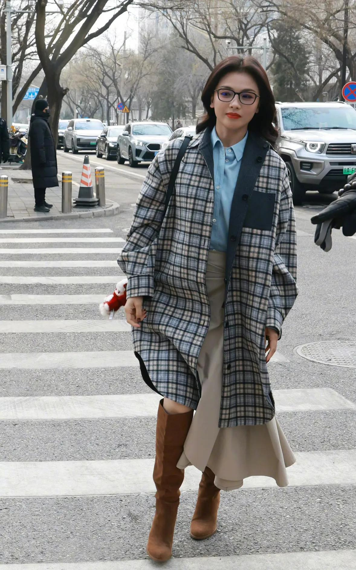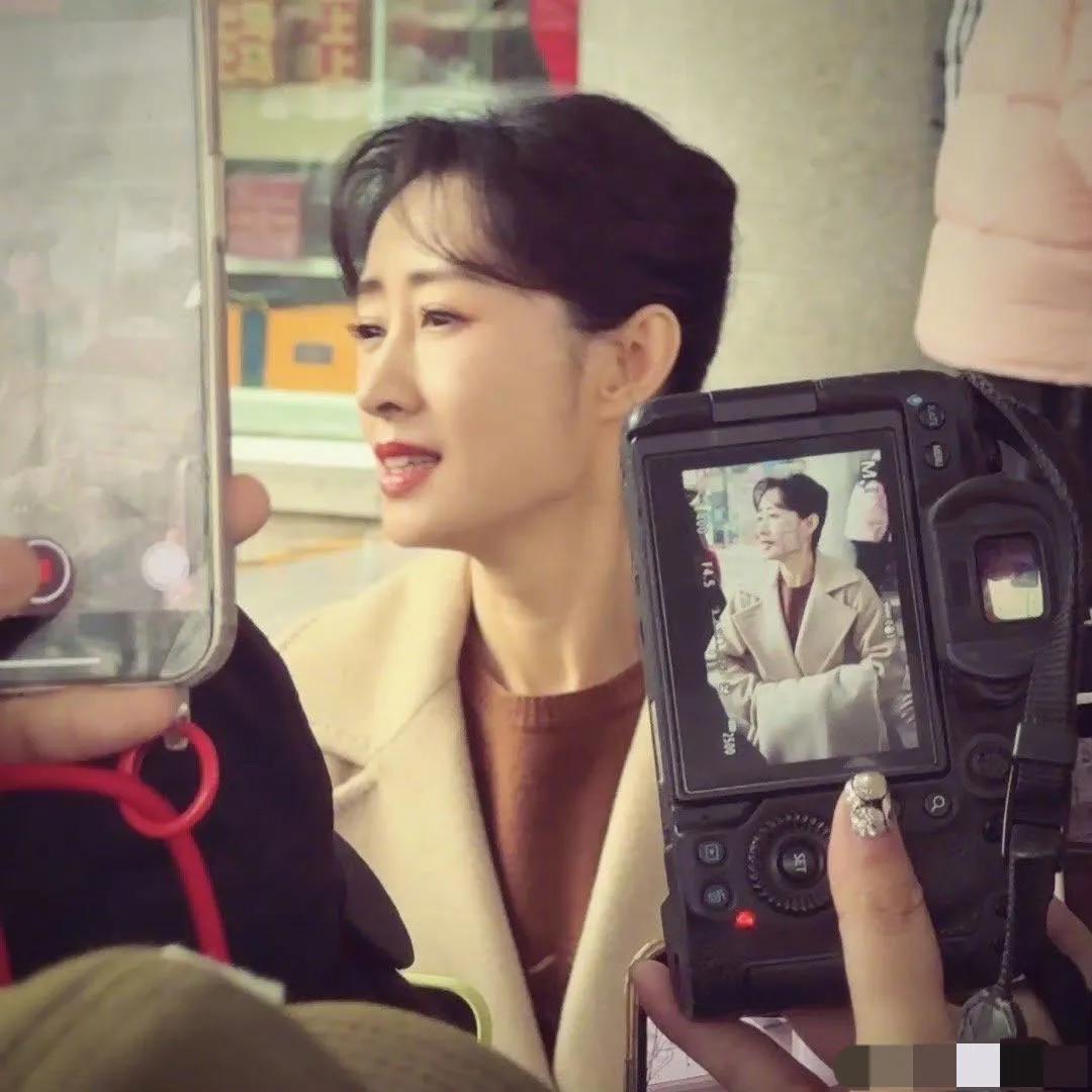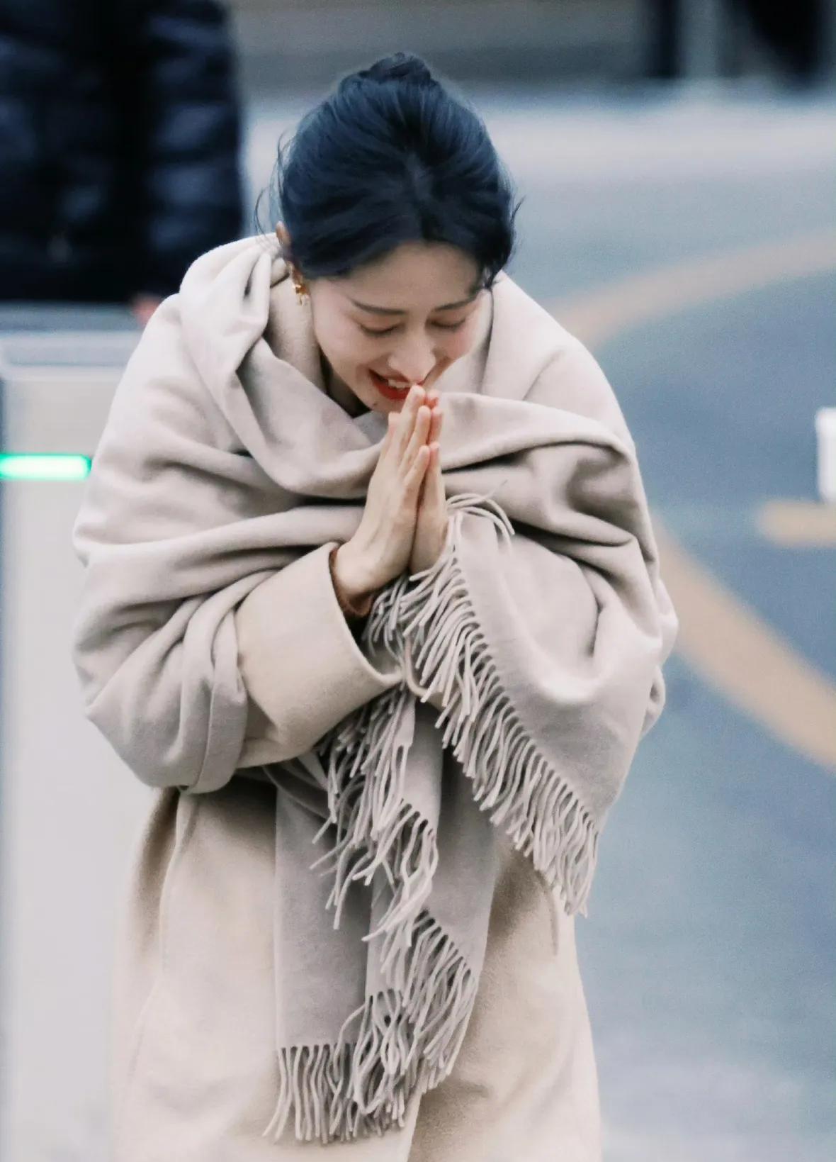 浅驼色大衣搭配同色系围巾,温柔的氛围感扑面而来,被媒体夸太美有气质后,敏涛姐双手合十,笑着说谢谢。