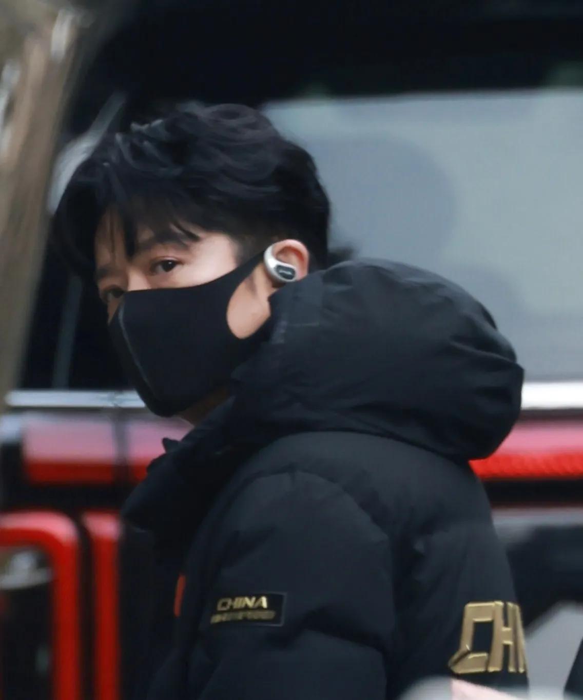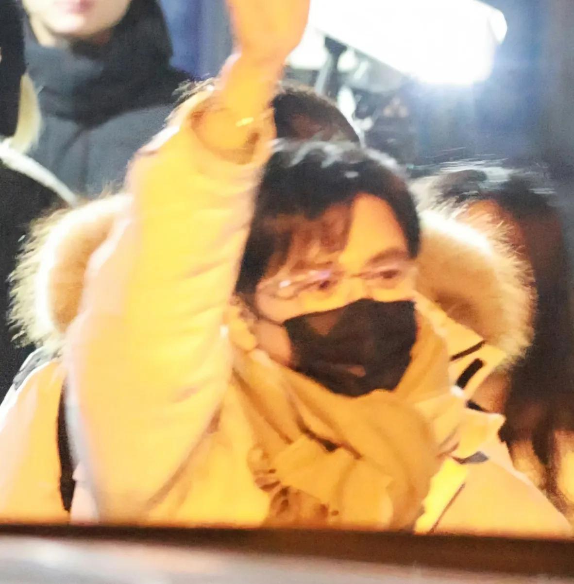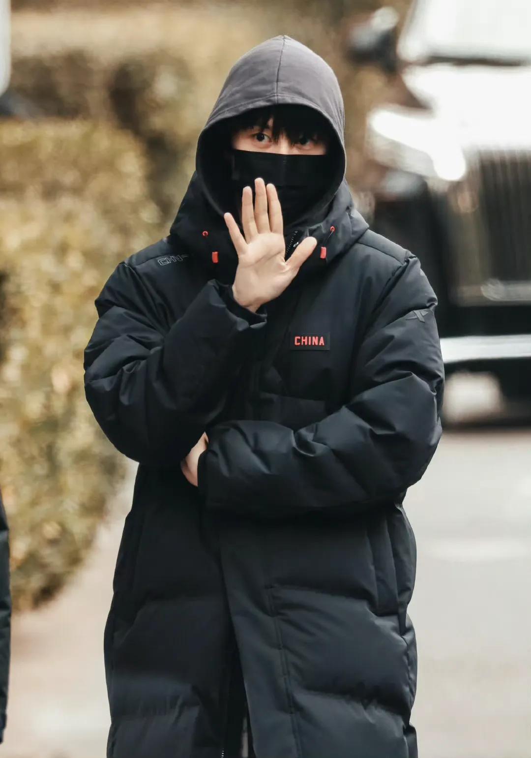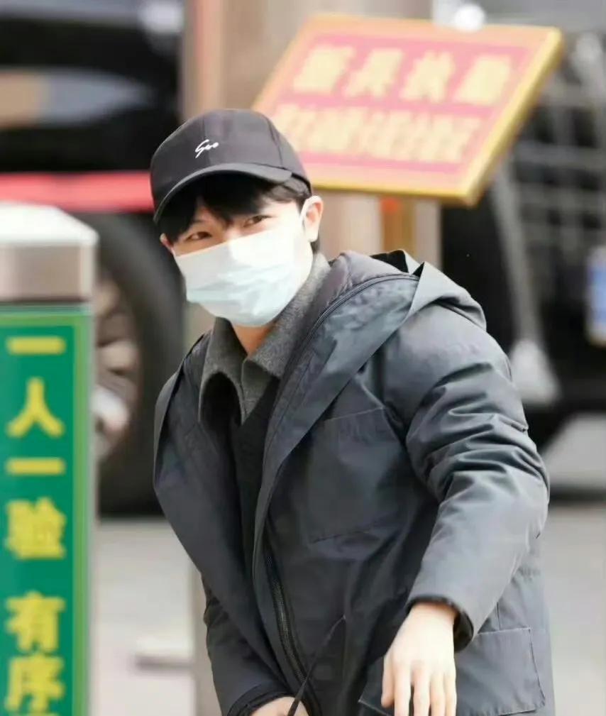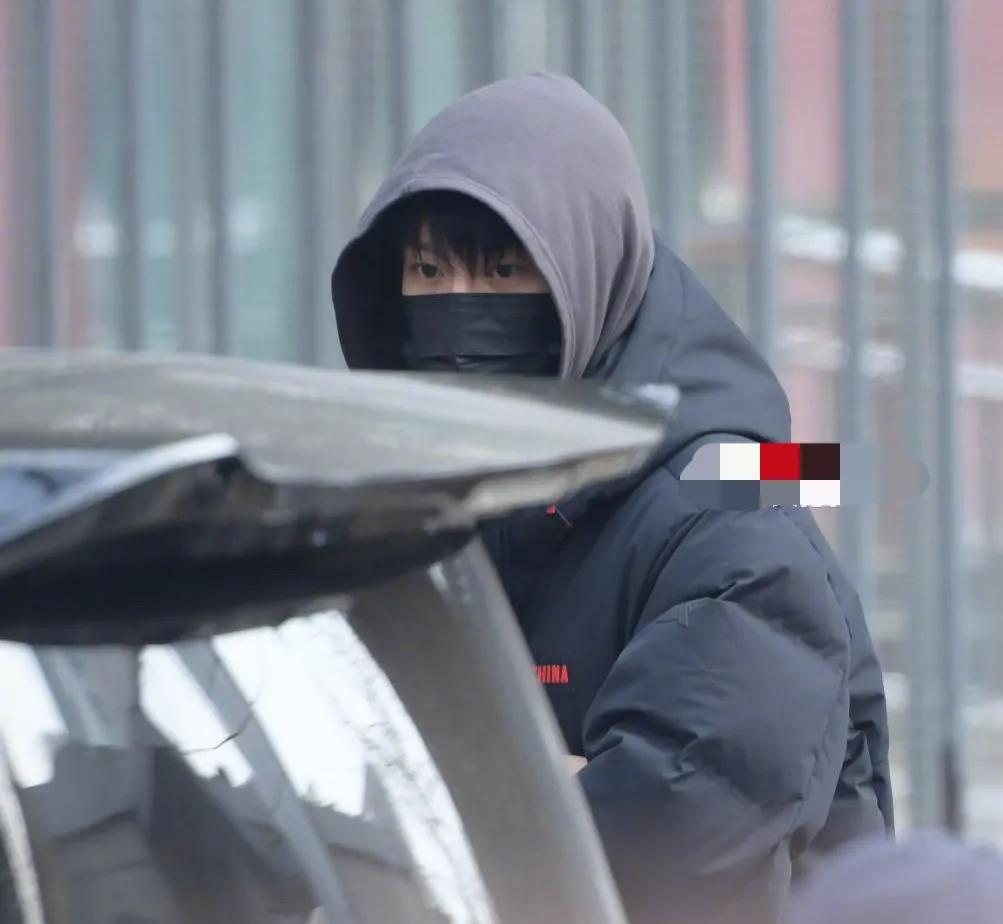 当天他包裹严实,身穿黑色羽绒服、戴着黑色口罩,头上还戴着卫衣帽子,很是低调。