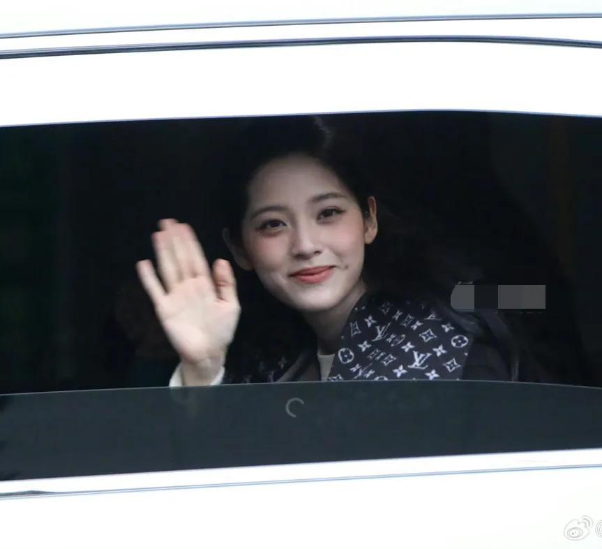 看到媒体后便笑着向媒体和粉丝挥手互动,双手合十拜年,同样一脸喜庆。