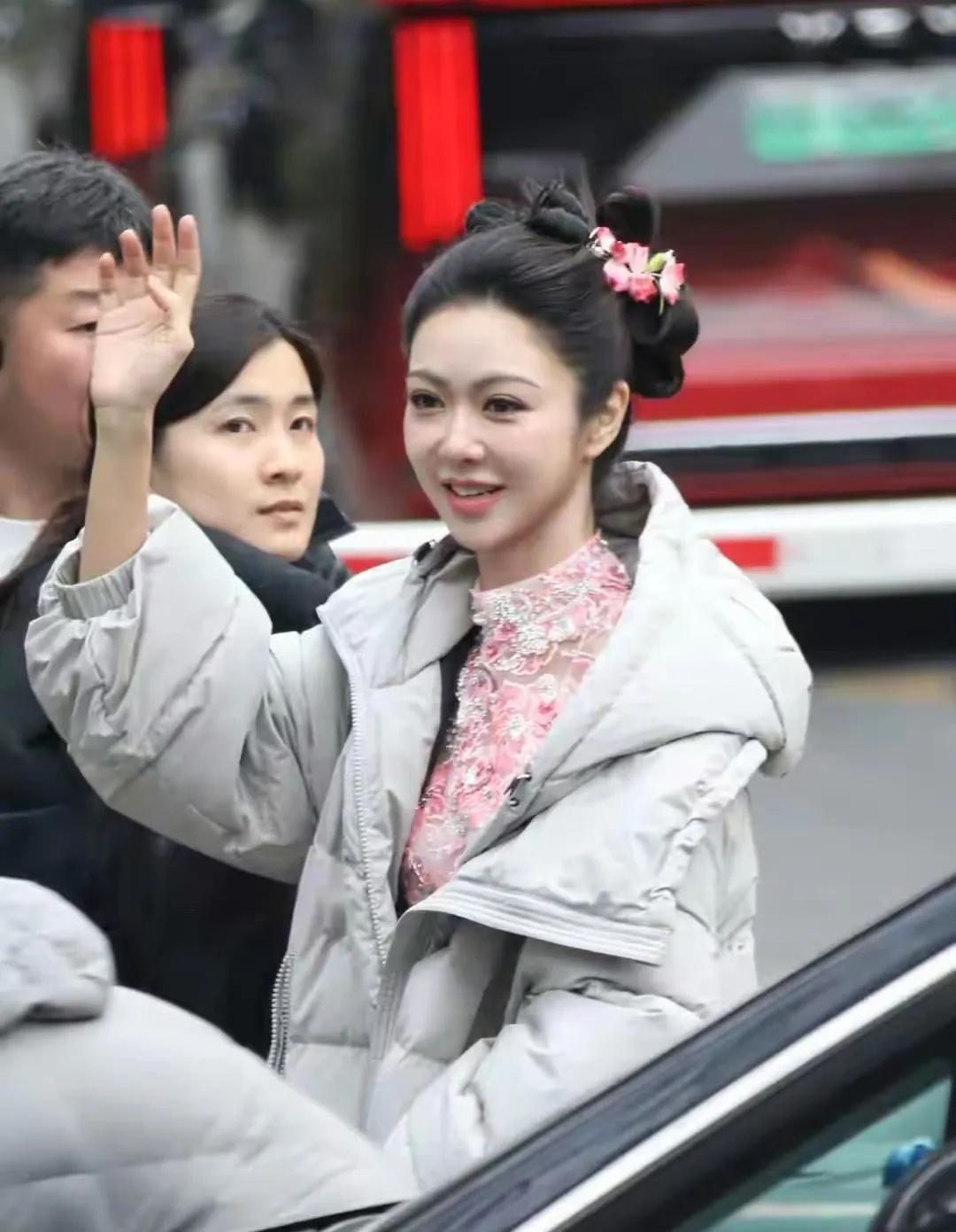 亮相时,她头戴粉白非遗绒花簪饰 ,双丸子头缀满立体花朵,内搭梅花刺绣改良旗袍。