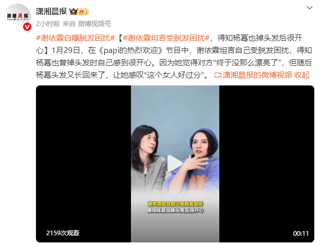 1月29日,在《papi的热烈欢迎》节目中,谢依霖坦言自己受脱发困扰,得知杨幂也掉头发时自己感到很开心。因为觉得对方“终于没那么漂亮了”,但随后杨幂头发又长回来了,让她感叹“这个女人好过分”。