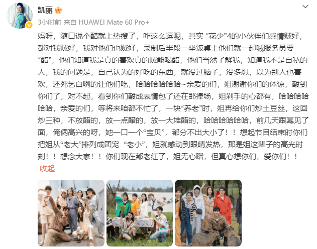 2月1日,演员张凯丽在社交平台发文,回应四年前在《花儿与少年》节目中因炒土豆丝过量放醋引发的趣事。她坦言:“我的问题是,自己认为的好吃的东西,就没过脑子,没多想,以为别人也喜欢,还死乞白咧的让他们吃。”并真诚向当时的小伙伴们致歉:“亲爱的们,姐谢谢你们的体谅,酸到你们了,对不起,看到你们酸成表情包了还在那捧场,姐剁手的心都有。”