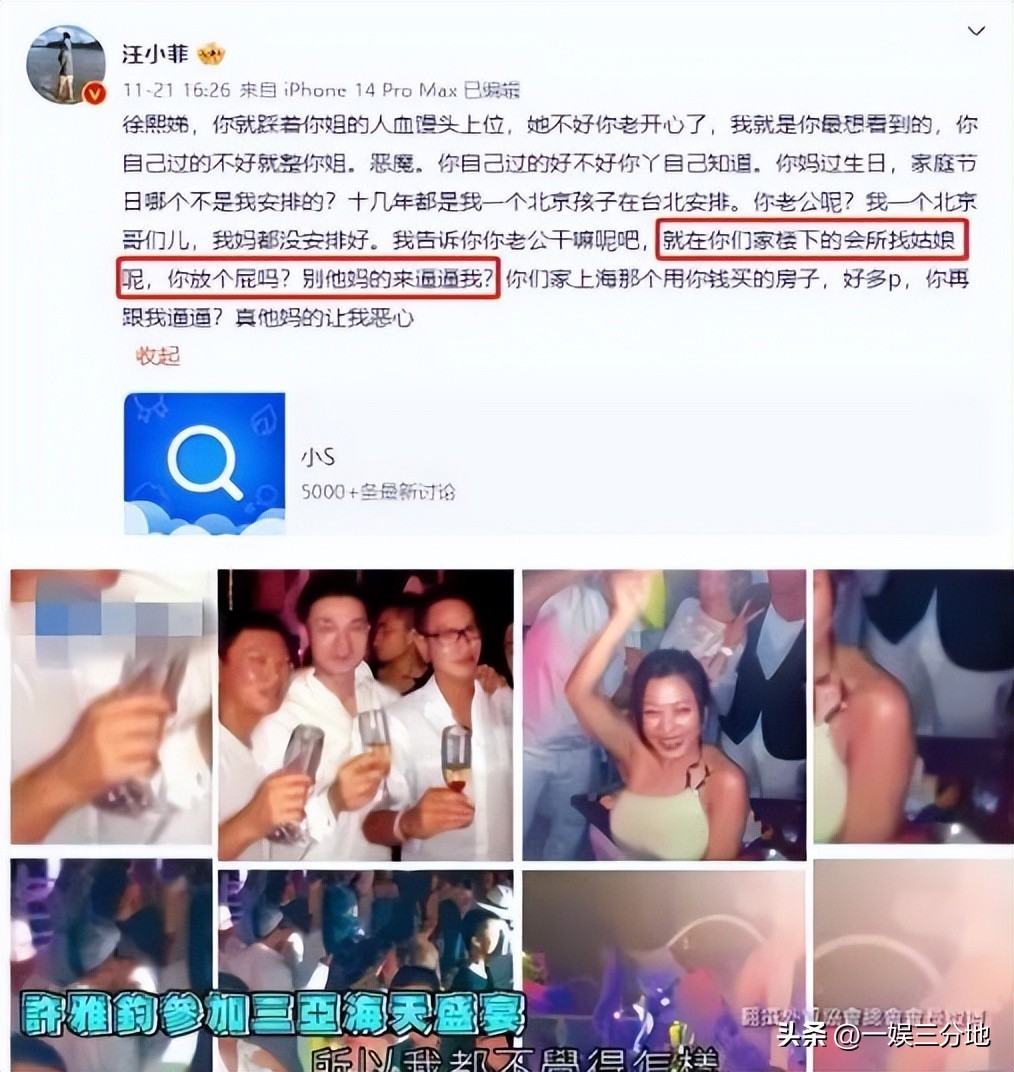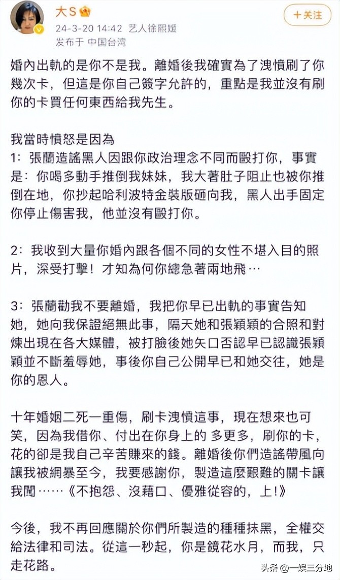大S曾发文揭露汪小菲婚内出轨,“十年婚姻两死一重伤”。