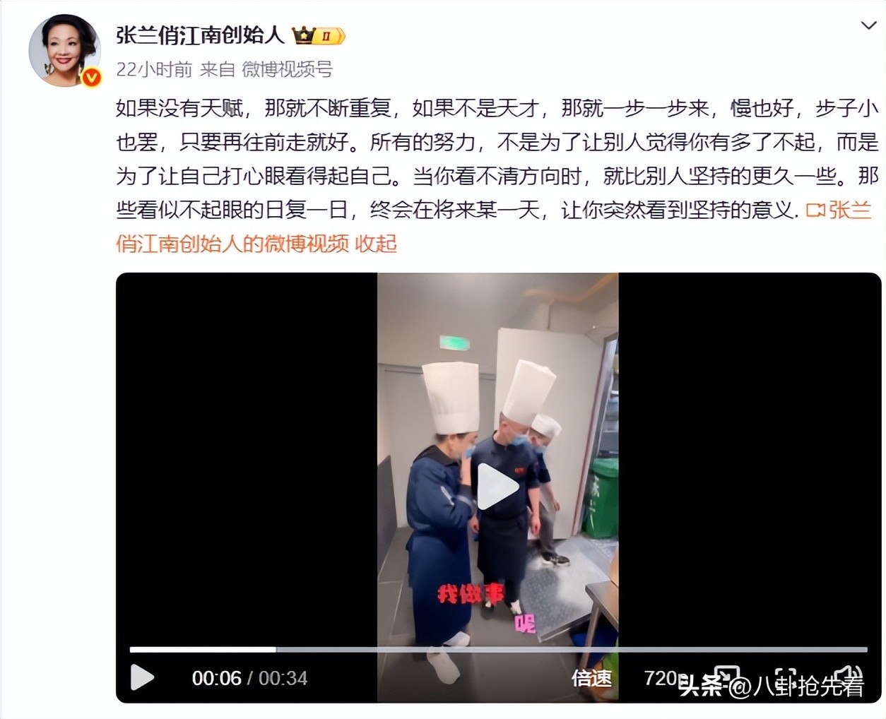2月10日张兰照常发文更新视频,完全不在意别人怎么说,给人一种不屑搭理的感觉,文案还特别励志,