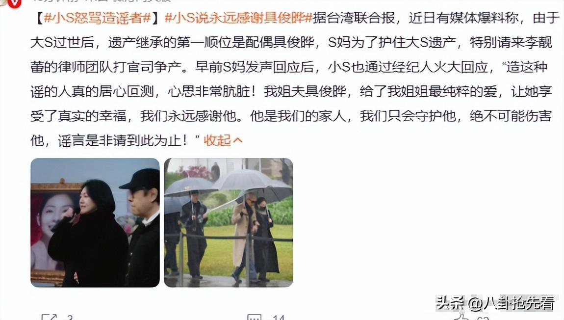 这件事过去以后,网上又造谣说S家要和老具打官司,因为遗产的事,不过在2月10日S妈出来回应了表示并不会打官司,