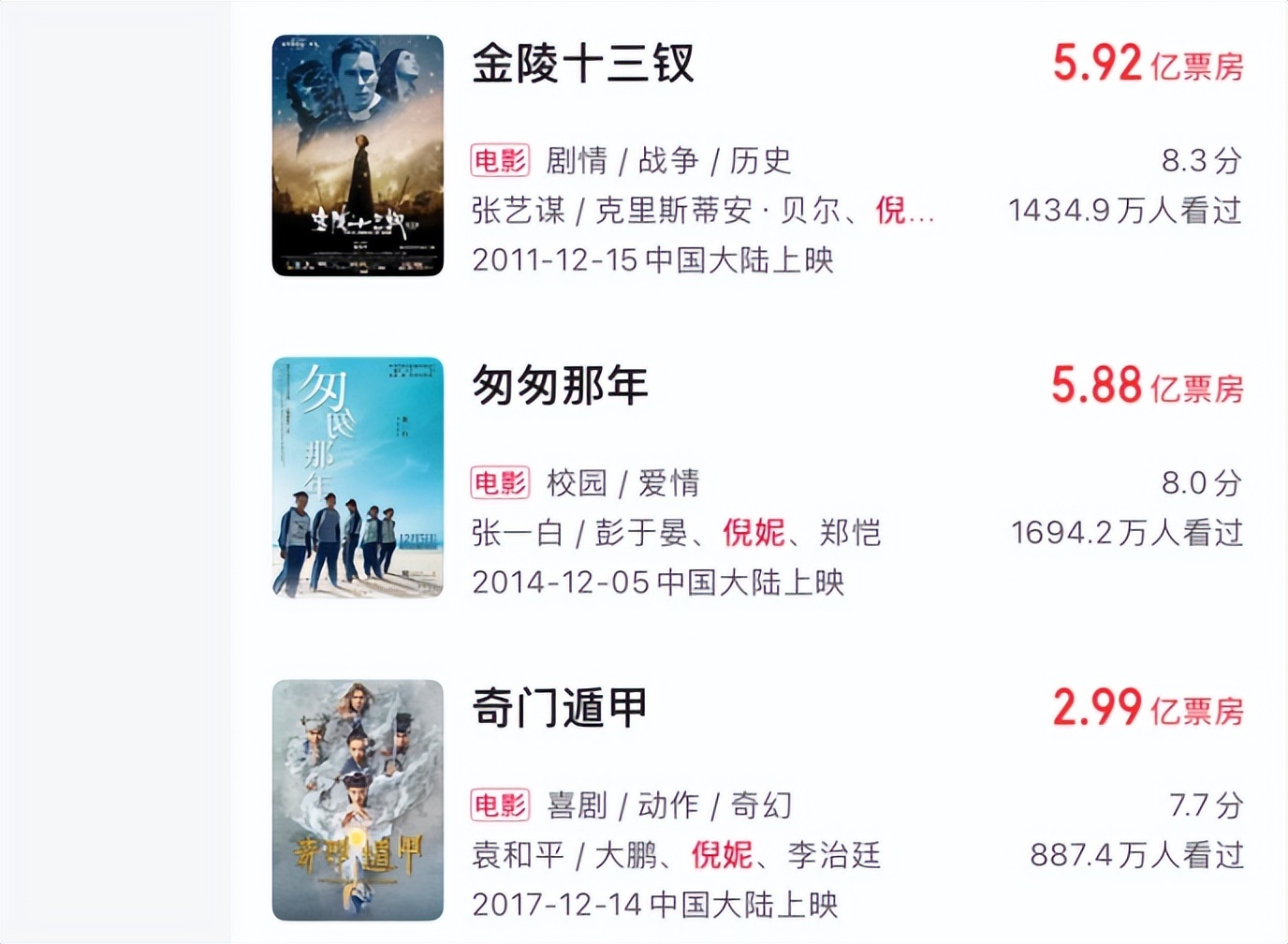 据悉,倪妮的起点更高,她的首部作品就是《金陵十三钗》。