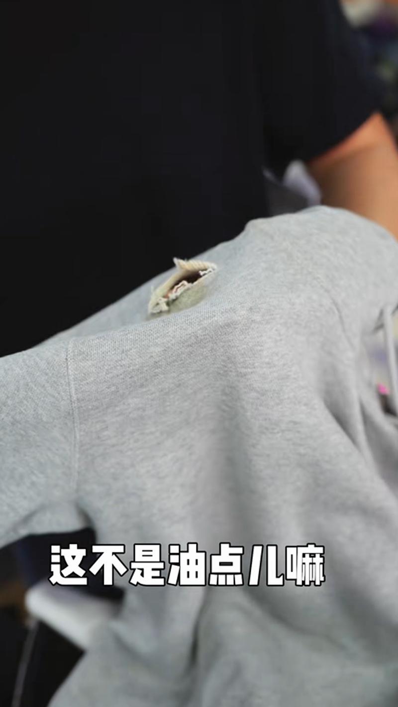 当然,明眼人都猜到了,这个可不是一手全新的衣服,而是二手衣服。就连卫衣的肩膀上都有油点和破洞。