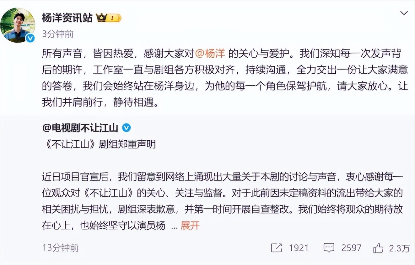 通篇看下来,杨洋字字句句都在顾及剧组,却没提一句自己的辛苦。