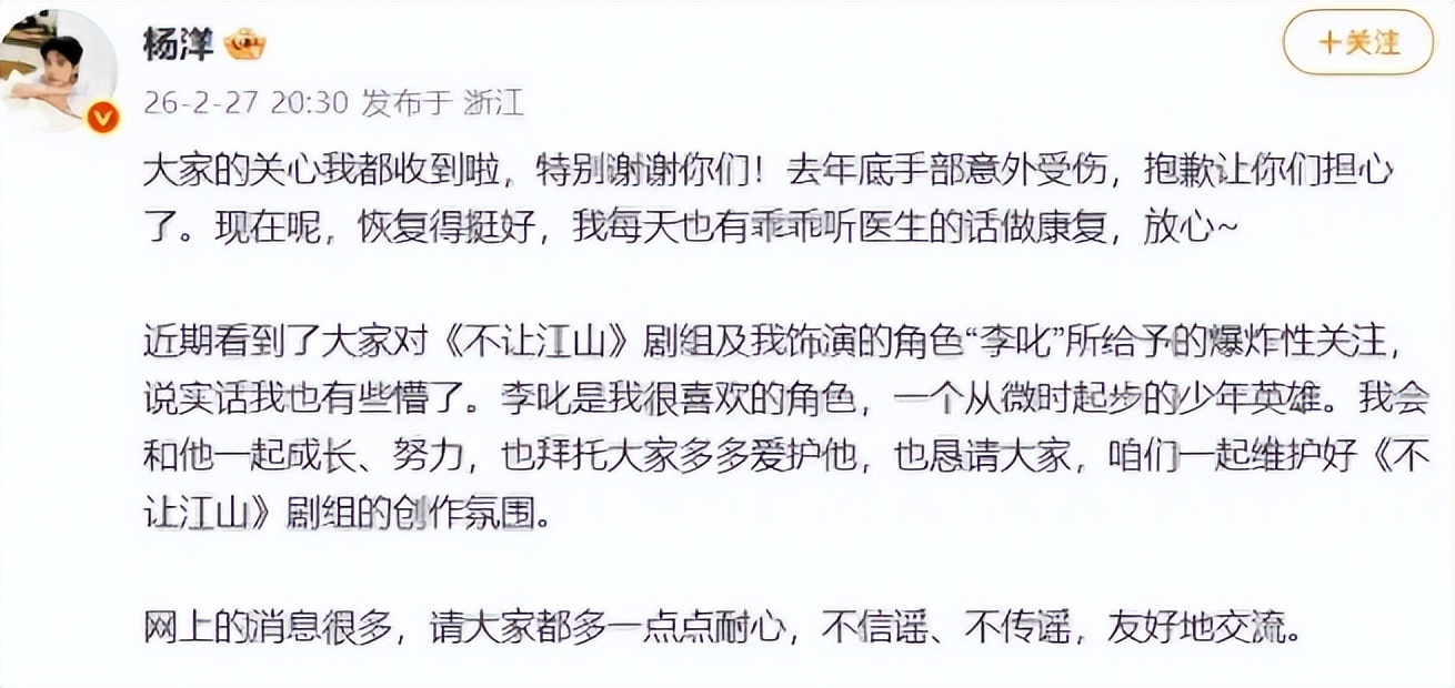 2月27日晚,杨洋再次发文回应,说自己每天都遵医嘱做康复,恢复得挺好,还拜托大家维护剧组的创作氛围,不信谣不传谣。