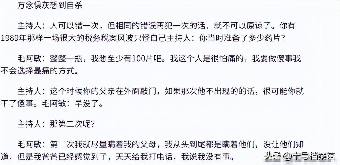 1996年,正当毛阿敏事业达到巅峰时,她又因税务问题遭遇了新的麻烦。这一次,她不仅再次遭到大众的严厉批评,还经历了经纪人自杀的惨剧,自己也曾一度动了轻生的念头。好在父亲及时发现,救回了她。毛阿敏认为,自己之所以陷入困境,根源在于自己没有仔细核对税单,导致了不必要的纷争。