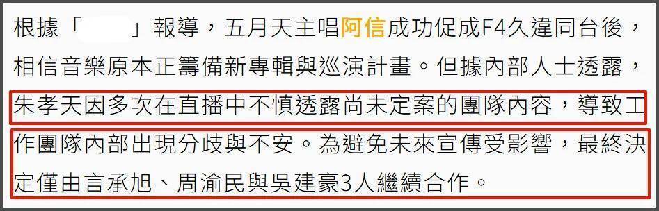 此前朱孝天在直播间直接曝光了后续F4会有单独的团体演唱会一事,还说已经在为了团体演唱会录新歌了,该说不该说的全都暴露,惹团队不满。
