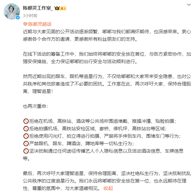 16日,陈都灵工作室针对艺人在高铁站被围挤至抱头自保一事发布声明。声明中提及,近期频繁出现的跟车、跟机等过度追星行为,不仅给陈都灵本人的安全带来隐患,也对公共秩序造成干扰,给其他旅客带来了不必要的困扰。工作室郑重呼吁,希望大家保持合理追星距离,秉持理性追星的态度,坚决杜绝私生饭的不当行为,共同抵制一切扰乱公共秩序的过度追星举动!