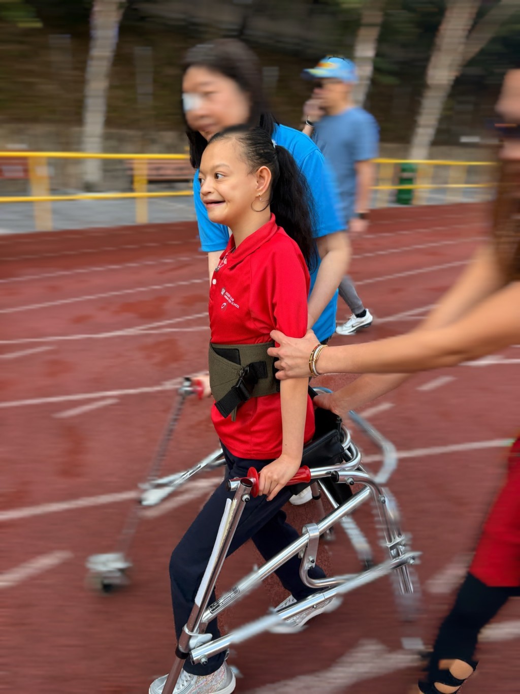 在钟丽淇发布的照片中,Isabella身着红色运动上衣,于跑道奋力前行。一幅画面里,她在父母扶持下迈步,展露灿烂笑颜;另一张则见她借助助行器独立行走,目光坚定有力。钟丽淇在帖文中难掩自豪:“三圈!400米 x 3 = 1200米!Isabella付出了巨大努力。”此次步行不仅是Isabella对自身极限的挑战,更承载慈善意义。钟丽淇透露,活动成功为“大埔火灾救援基金”筹得3620元善款,她感动写道:“感谢Isabella步行马拉松赞助者的支持,我们为你骄傲,Bellaaaaa!”字里行间满溢母爱的欣喜与骄傲。