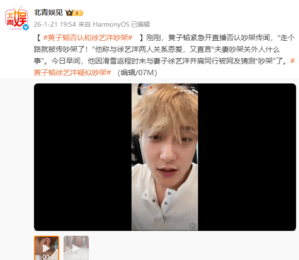 1月21日,黄子韬突然开启直播,正面回应网络上传出的与妻子徐艺洋“吵架”的猜测。他直言:“走个路就被传吵架了!”并表示两人关系一直很恩爱,更反问道:“夫妻吵架关外人什么事?”