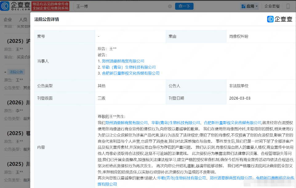 企查查APP显示,近日,郑州酒要醉商贸有限公司、华勒(青岛)生物科技有限公司、合肥新巨量影视文化传媒有限公司相继向王一博公开赔礼道歉。上述公司在未经合法授权的情况下,擅自使用王一博肖像进行商业宣传,构成肖像权侵权。