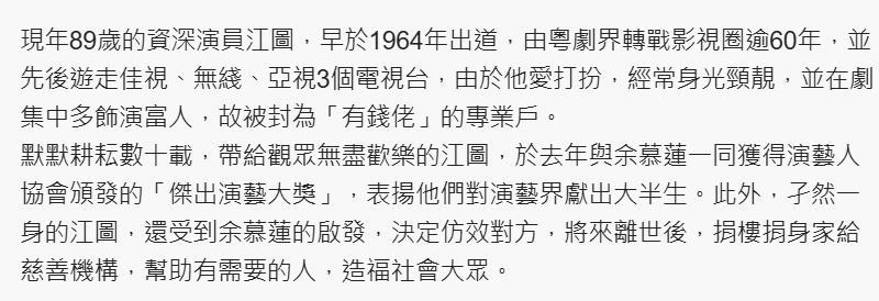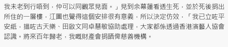 江图今年3月接受港媒专访,他表示,见到同行余慕莲看透生死,捐赠身家给慈善团体,江图觉得这个安排很有意义,所以决定仿效。