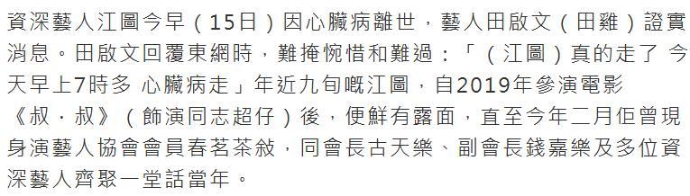 4月15日早上,香港老戏骨江图(本名蔡志祥)因心脏病离世,“娱乐圈大总管”田启文证实消息。