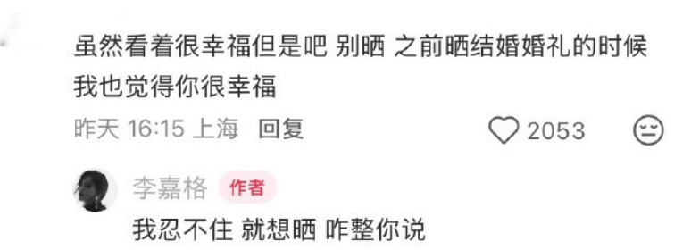 近日,李嘉格晒出和男友接吻照,被网友劝别晒,对此,李嘉格回应称:“我忍不住,就想晒,咋整你说。”