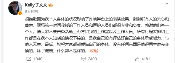 2月2日,于文文在社交平台发文,回应自己在演唱会上突发晕倒的情况。她在文中首先感谢了大家的关心,同时坦言现场的工作人员和医护人员都十分专业,还特意叮嘱大家不要责备此次活动的主办方和工作人员,并表示:“是我自己没有评估好自己的身体承受能力,与他人无关。”除此之外,于文文也借着这件事提醒大家要爱惜身体,感慨道:“除了健康,什么都不是你的。”