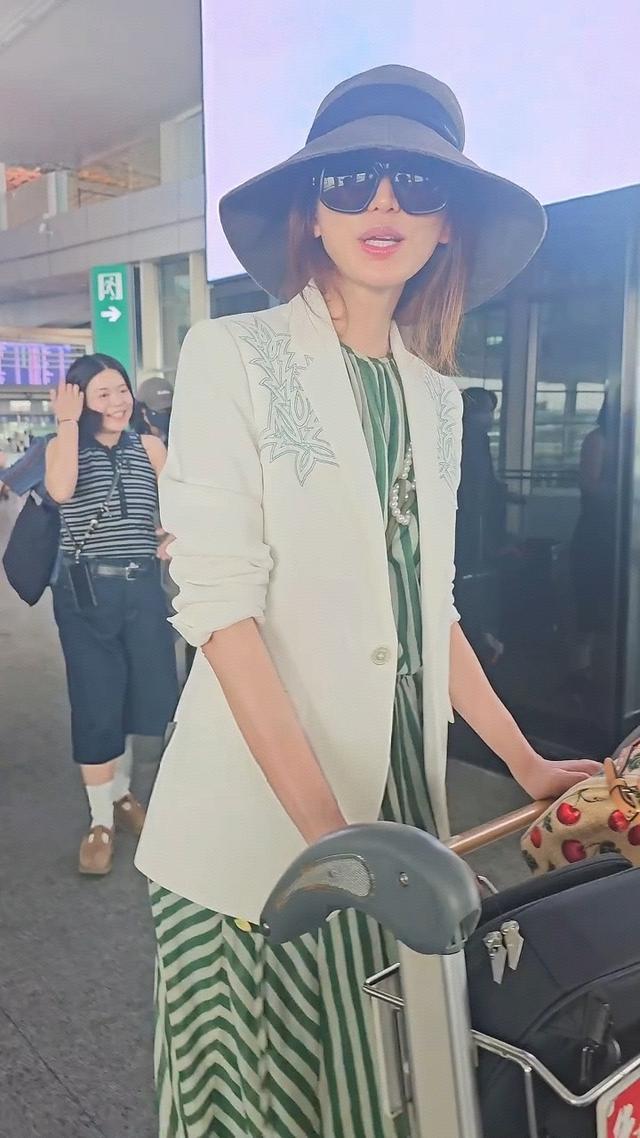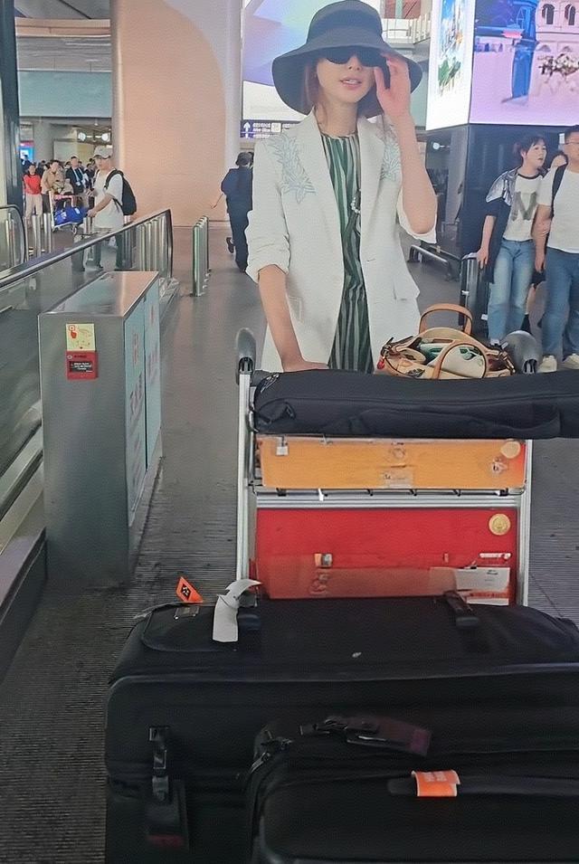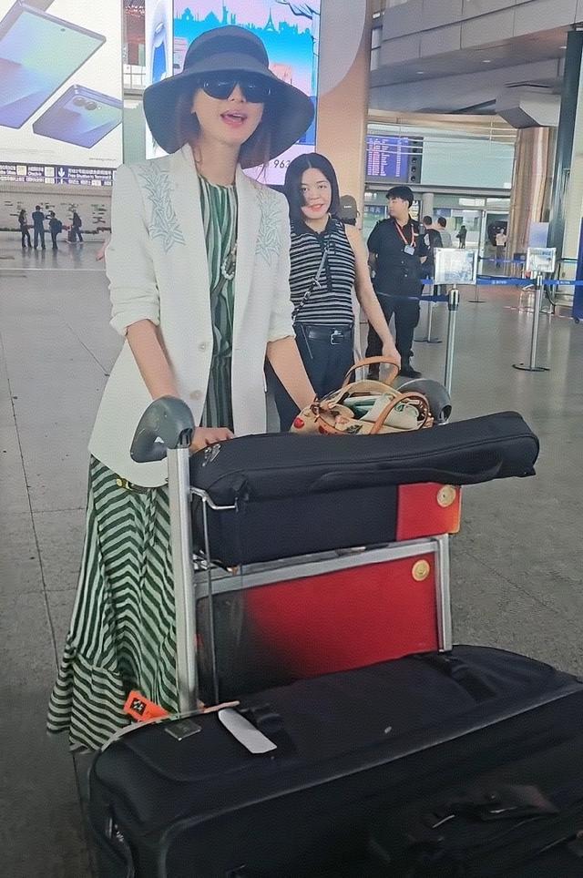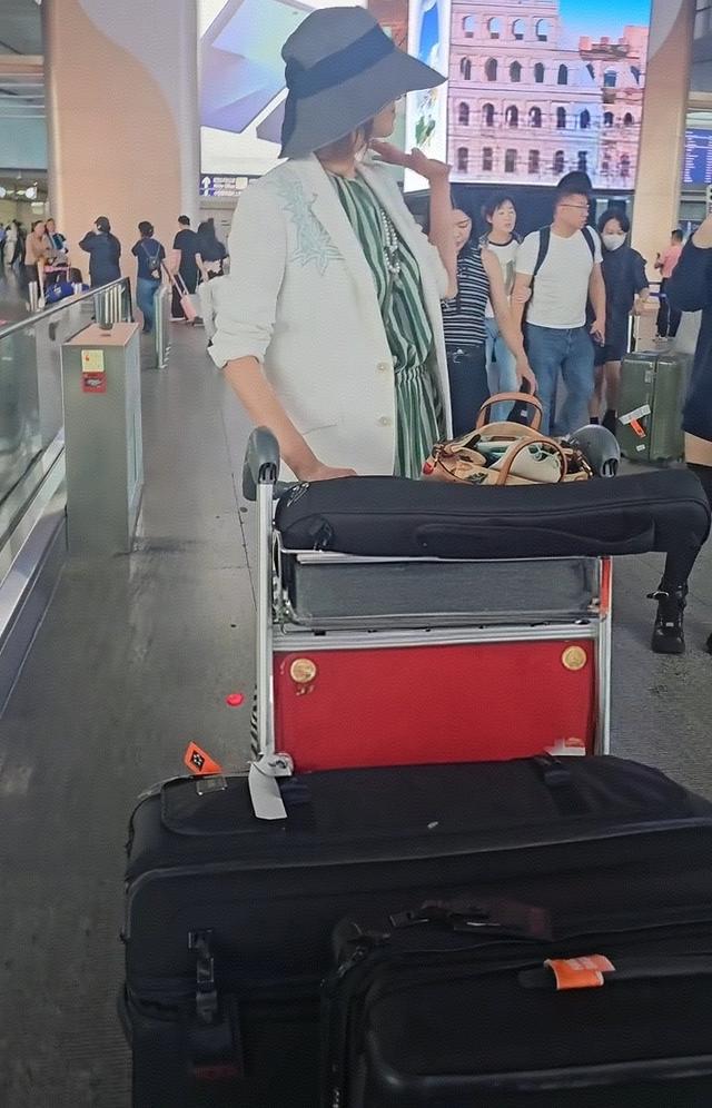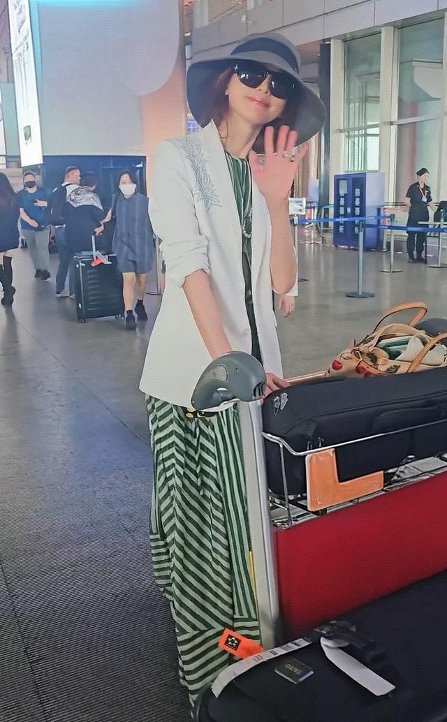 在机场偶遇了50岁林志玲,她穿着竖纹蓝色衬衣,外搭一件白色衬衫,看起来妈味十足,独自一人推着大大的两个行李箱,面露憔悴了。