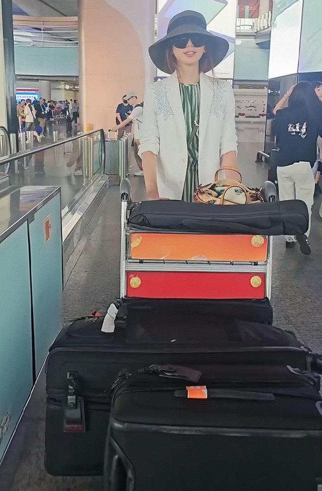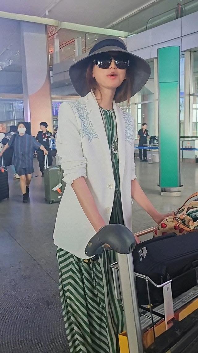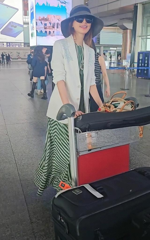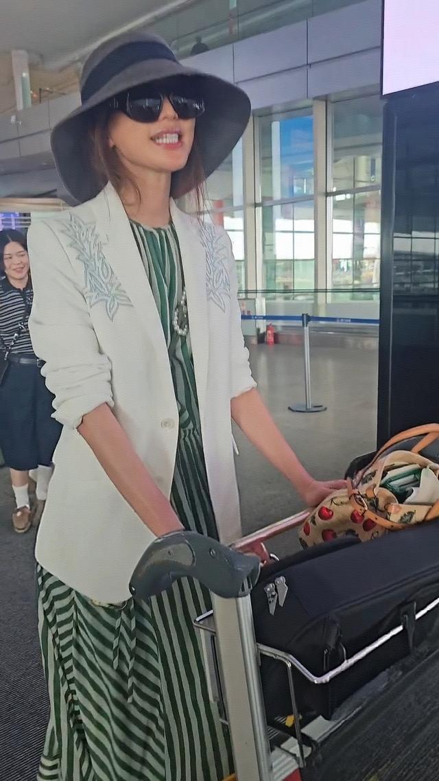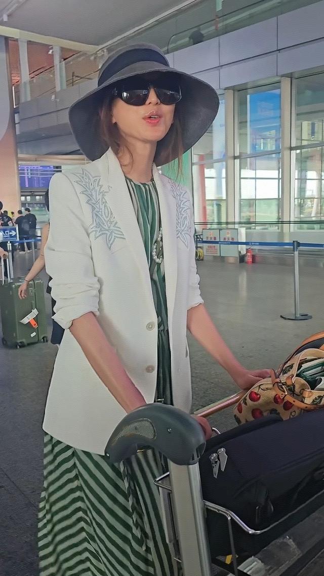 在机场偶遇了50岁林志玲,她穿着竖纹蓝色衬衣,外搭一件白色衬衫,看起来妈味十足,独自一人推着大大的两个行李箱,面露憔悴了。