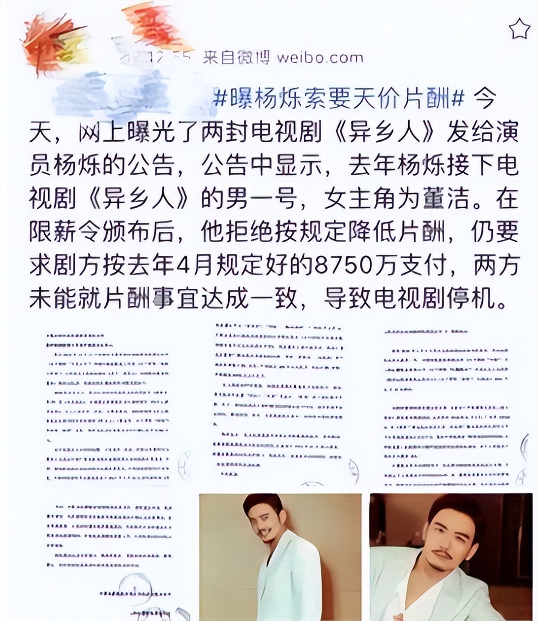 早在“限薪令”发布前三个月,杨烁就与《异乡人》剧组签订了合同,饰演男主角“路洋”,约定片酬金额较高,大概在八千多万。