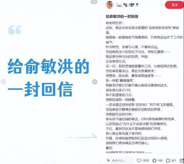 有新东方员工在网上发了一封给俞敏洪的回信,信中说你在南极看冰山,我在出租屋里看电脑上的数字,唯一能和南极媲美的是坏了三次的暖气,你的南极冰川在阳光下闪光,我的手机提示未读消息在闪红点……