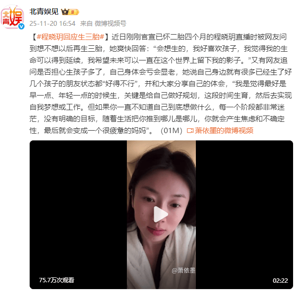 近日,官宣怀二胎已经四个月的程晓玥直播时被网友问到以后是否还会再生三胎,她表示:“会想生的,我好喜欢孩子,我觉得我的生命可以得到延续,我希望未来可以一直在这个世界上留下我的影子。”