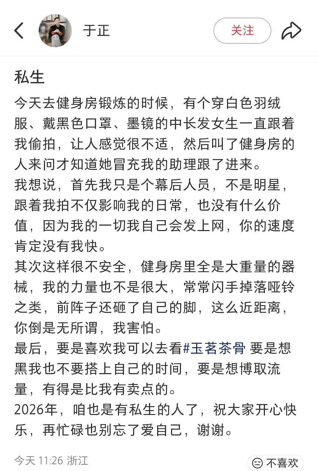 他在文中最后调侃道:“2026年,咱也是有私生的人了。”此次发文引发网友关注,不少人对幕后工作者也遭遇此类骚扰表示意外。