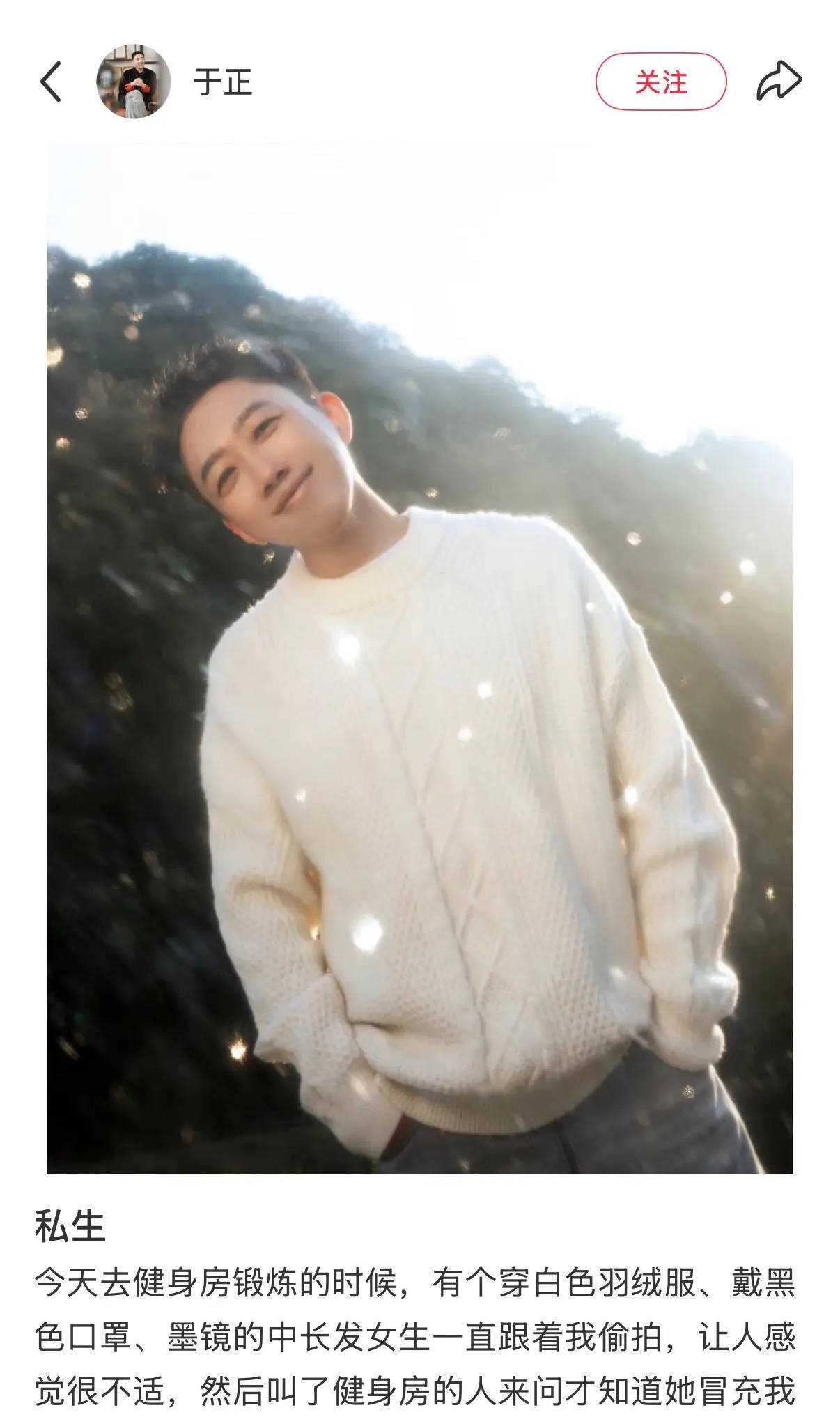 1月11日,制片人于正在社交平台发文,透露自己在健身房遭遇偷拍。据他所述,事后询问工作人员才得知,对方是冒充其助理身份跟随进入。于正对此表示不解与担忧,他表示:“我只是个幕后人员,不是明星,跟着我拍不仅影响我的日常,也没有什么价值,这样很不安全,健身房里全是大重量的器械,要是想黑我也不要搭上自己的时间。”