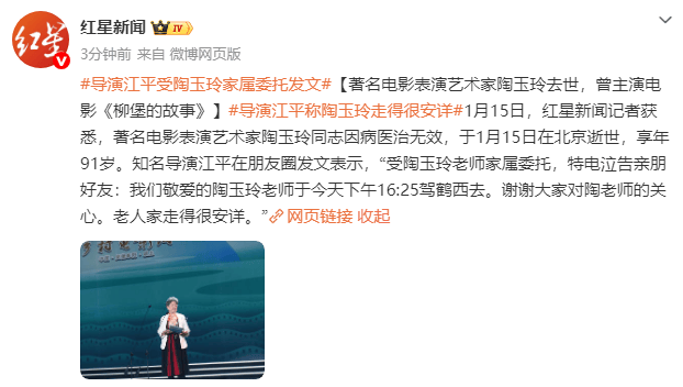 知名导演江平发文表示,“受陶玉玲老师家属委托,特电泣告亲朋好友:我们敬爱的陶玉玲老师于今天下午16:25驾鹤西去。谢谢大家对陶老师的关心。老人家走得很安详。”(来源:红星新闻)