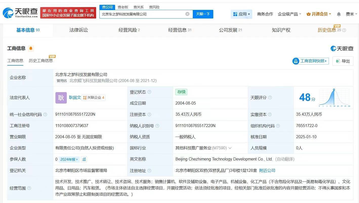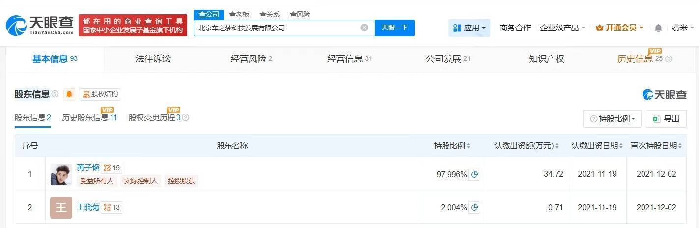 企查查APP信息显示,近日北京车之梦科技发展有限公司新增两条欠税公告,累计欠税余额达14.1万余元,欠税税种包含增值税、印花税,该欠税信息由国家税务总局北京市朝阳区税务局发布。据企查查登记信息,这家公司成立于2004年8月,注册资本35.43万元,其中黄子韬持有该公司97%的股份。