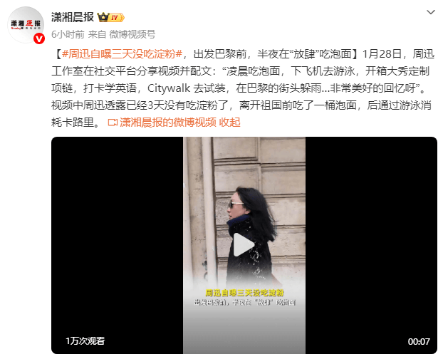 视频中,周迅透露自己已经三天没有摄入淀粉类食物,临出发前吃了一桶泡面,随后通过游泳来消耗相应热量。