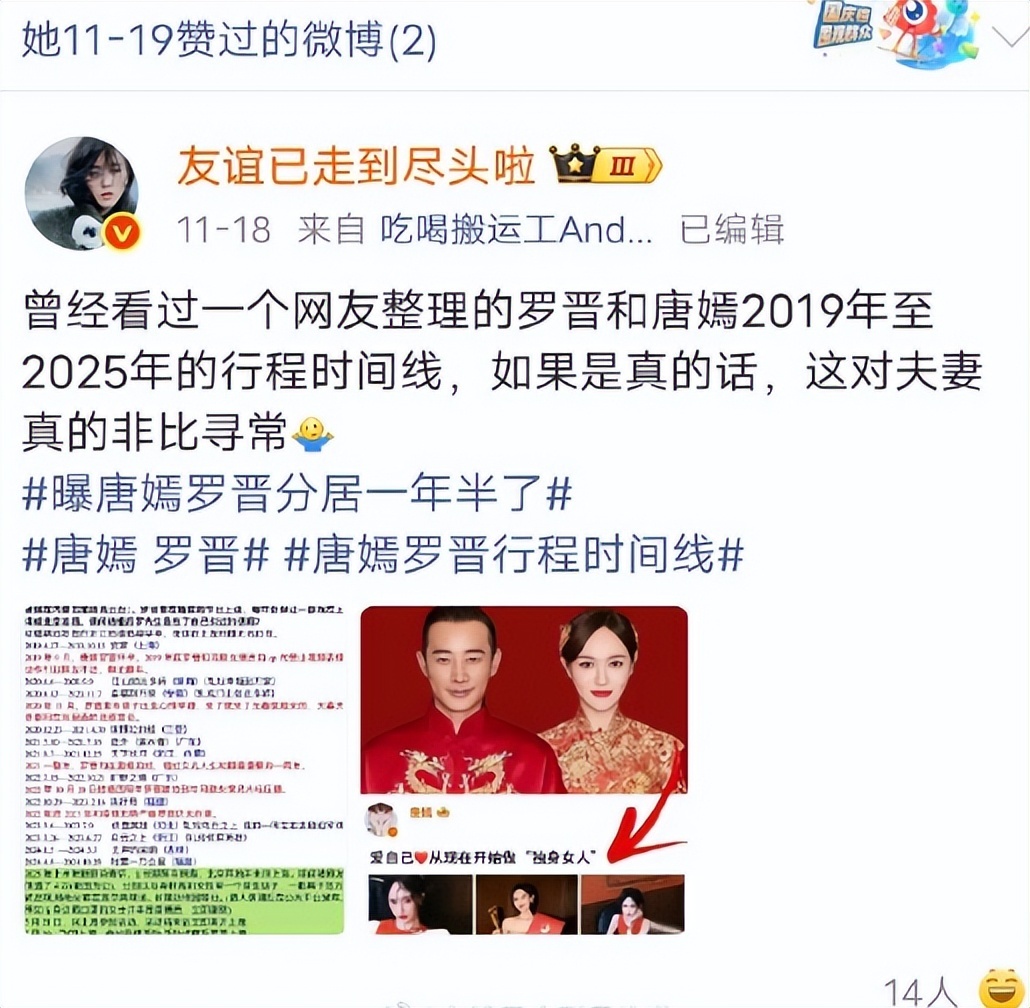 这段时间她与罗晋的感情状态一直被质疑,尤其是女明星张歆艺点赞了俩人分居的动态,