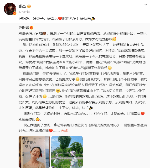 随后,张杰转发该文并甜蜜回应:“好妈妈、好妻子,好幸运跳俏八岁!好快乐!”夫妇二人温馨互动,展现出幸福的家庭氛围。
