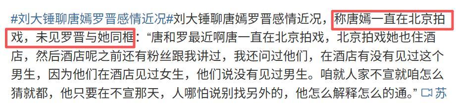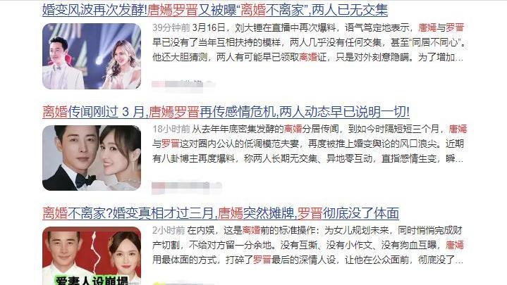 直播结束后,“罗晋唐嫣同城不同居”“刘大锤爆料唐嫣罗晋婚变”等话题迅速霸屏热搜。