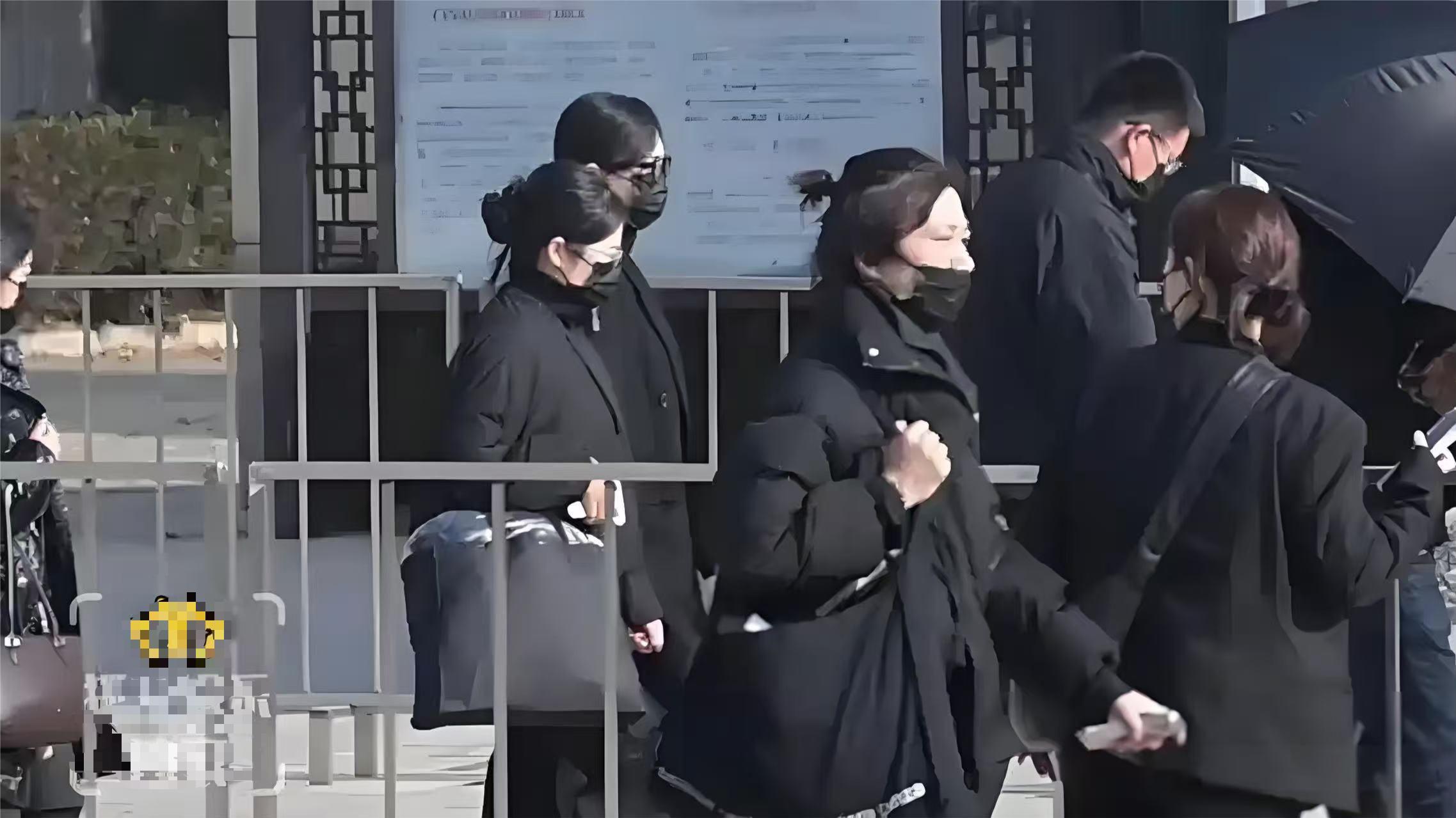 葬礼上,唐嫣身着素色黑衣、佩戴孝带。