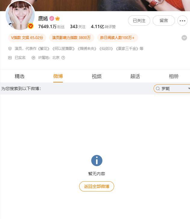 有细心的网友发现,在唐嫣微博搜索罗晋,结果一片空白。