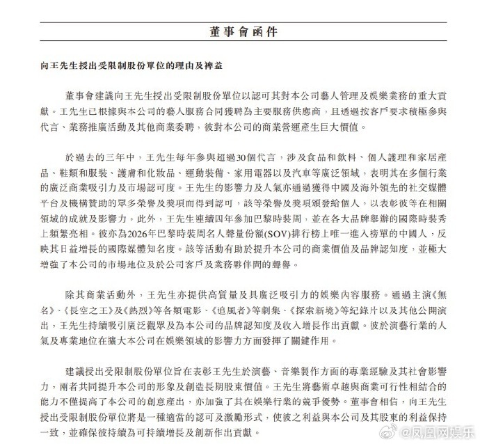 根据乐华娱乐3月25日公开的董事会函件,公司建议有条件向@UNIQ-王一博 提供股份奖励:旨在认可及奖励其对集团业务做出的卓越贡献,寻求维持与王一博的长期合作。函件建议向王一博授出1250万个受限制股份单位,认购价每股0.01港元,占已发行股份约1.51%,相关激励需待股东特别大会审议通过后方可生效。