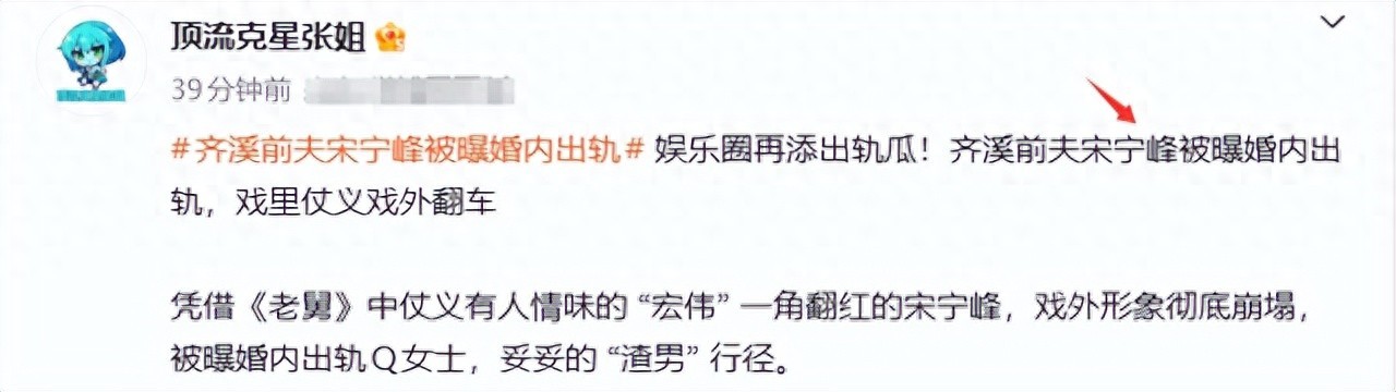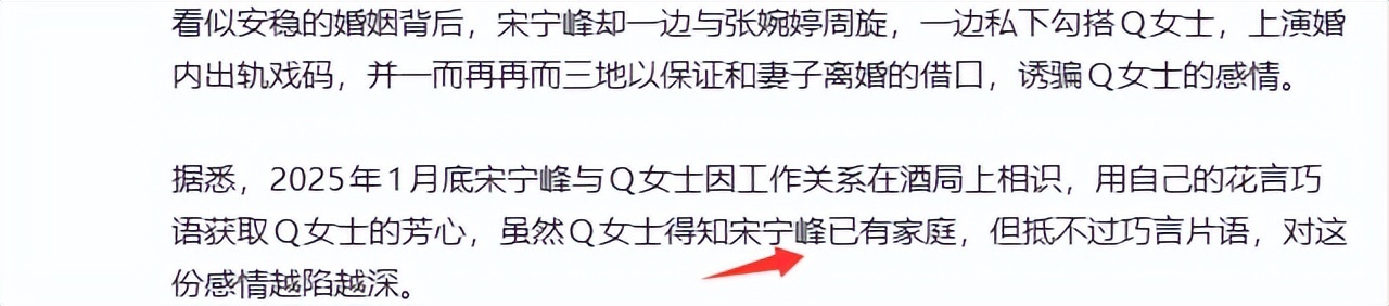 据知名狗仔“张姐”发文爆料称,去年(2025)1月底,演员宋宁峰在一次商务酒局上邂逅风华正茂的圈外Q女士,前者不顾有妇之夫身份向对方发动“花言巧语”及“金援”攻势最终俘获其芳心。