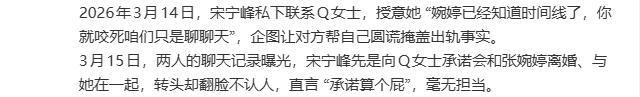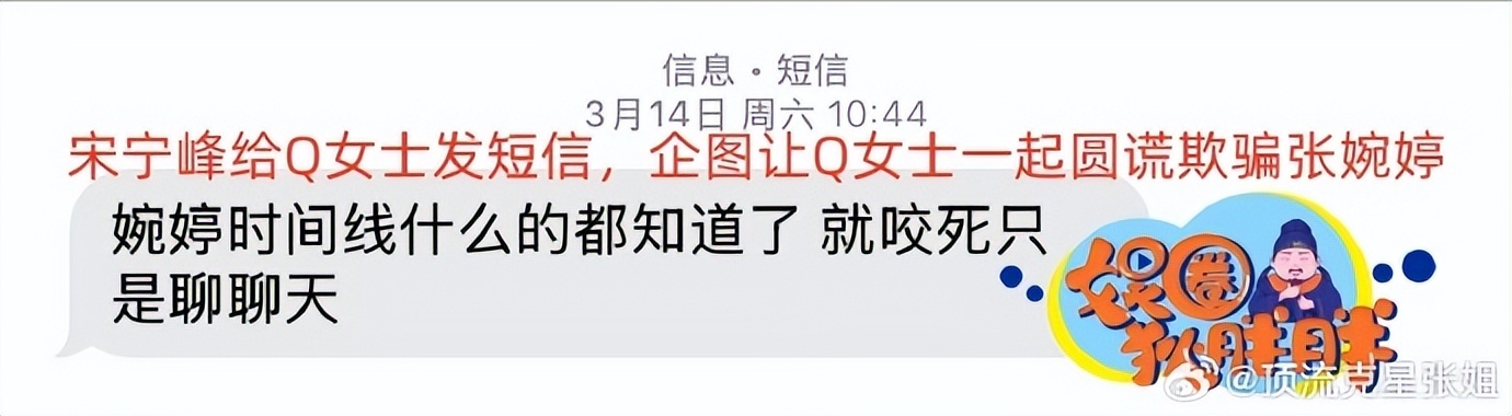 这段“不伦之恋”持续一年多以来,虽说双方都谨慎低调约会,但世上并没有不透风的墙,就在正宫太太察觉这桩婚外情之际,宋宁峰紧急出招——私下联系Q女士,让后者帮其“圆谎”遮掩,直接咬死称“(两人)只是聊聊天”而已,并再次承诺离婚后会娶对方。