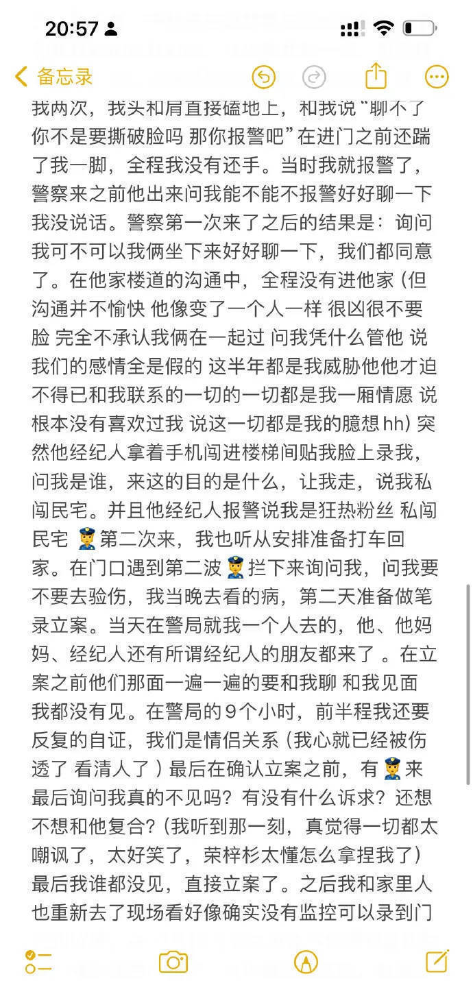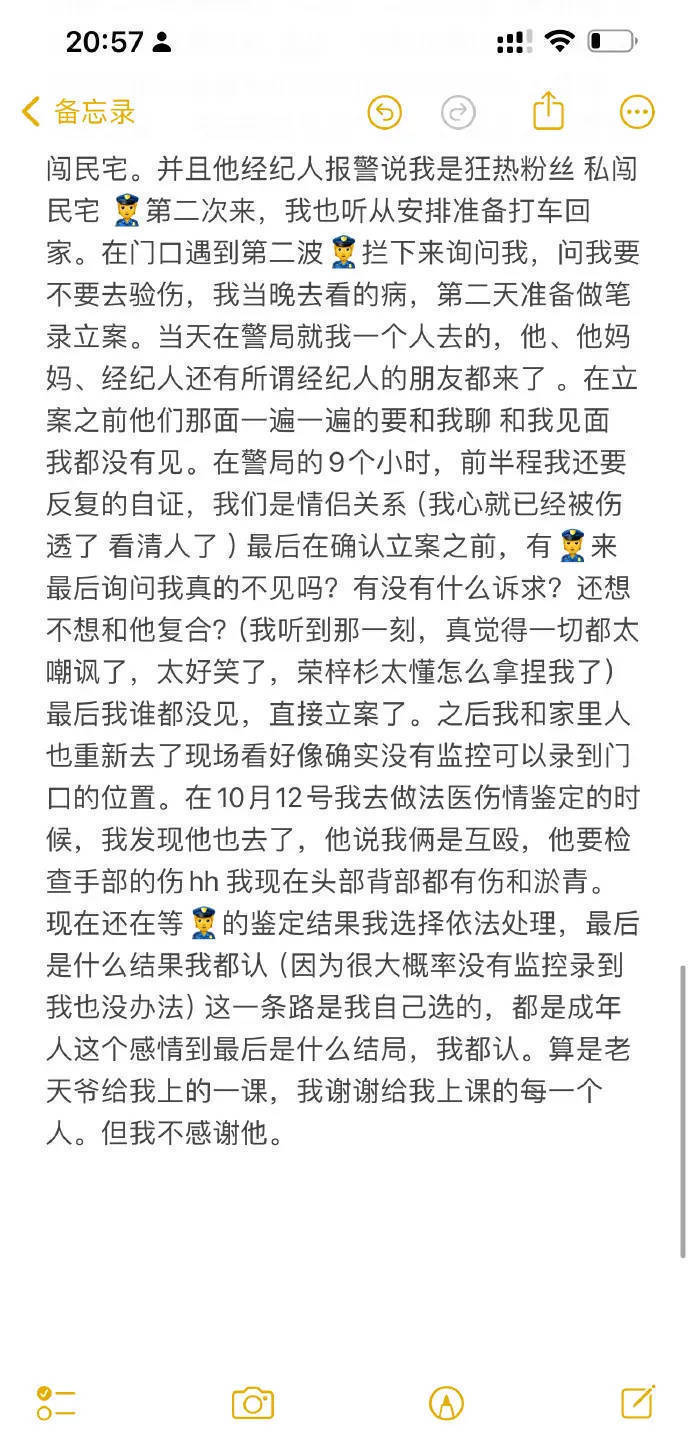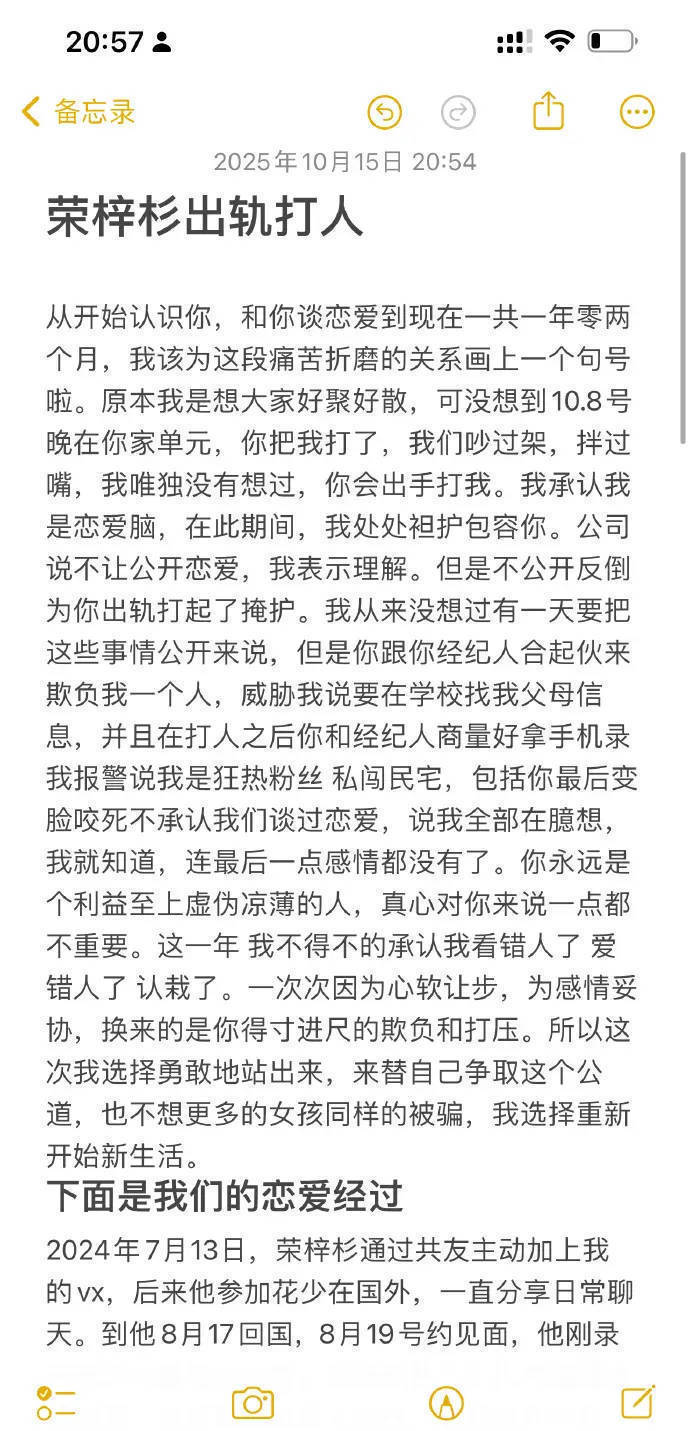 此前一日,她曾发布长文指控荣梓杉在三个月恋爱期间实施冷暴力、与多名女性暧昧交往,并存在动手行为,还附上医院出具的中度焦虑和抑郁诊断证明,要求对方道歉。