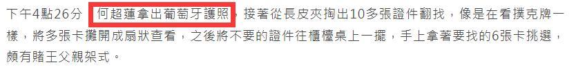 下午4点26分,何超莲拿出葡萄牙护照,接着从长皮夹掏出10多张证件翻找,像是在看扑克牌一样,将多张卡摊开成扇状查看,之后将不要的证件往柜台桌上一摆,手上拿着要找的6张卡挑选,颇有赌王父亲架式。