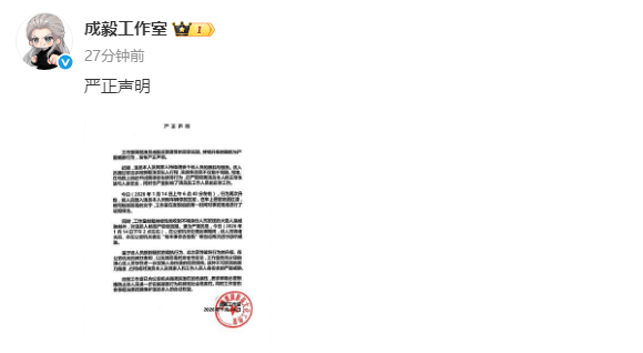 1月14日,成毅工作室在社交平台上发布严正声明,声明中表示成毅及家人持续遭受个别人员的跟踪与骚扰,实施包括但不仅限于尾随、围堵、在马路上追赶并试图逼停车辆等行为,甚至车辆遭到恶意喷洒红漆、收到人身威胁邮件,对演员人格尊严恶意践踏。工作室已向公安机关要求采取必要措施,也将拿起法律武器维权。
