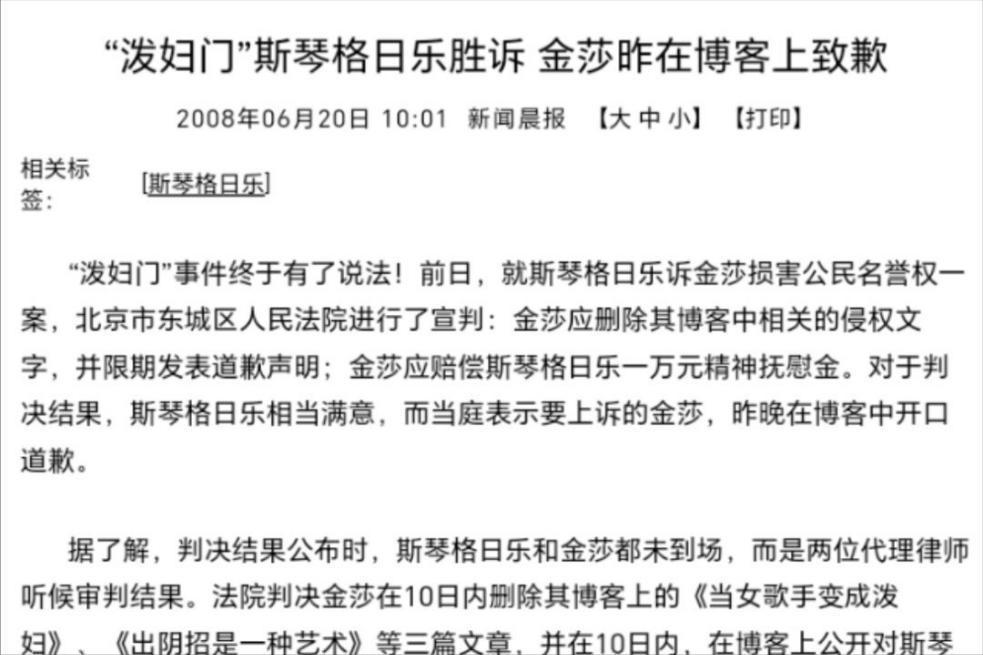最有争议的就是2008年的“泼妇门”官司,当时金莎在博客发文称斯琴格日乐说粗口,被对方以诽谤告上法庭,最终法院一审判决金莎败诉,斯琴格日乐获赔1万元。