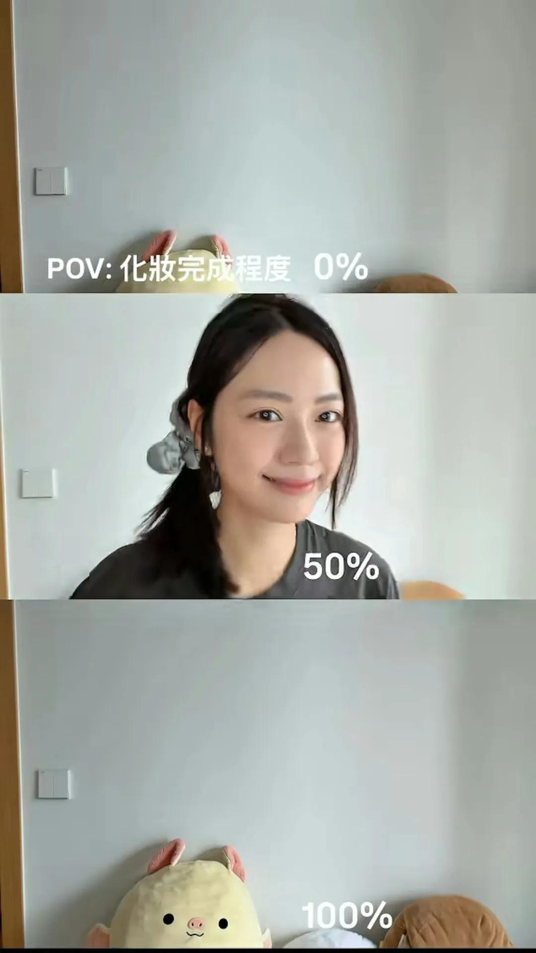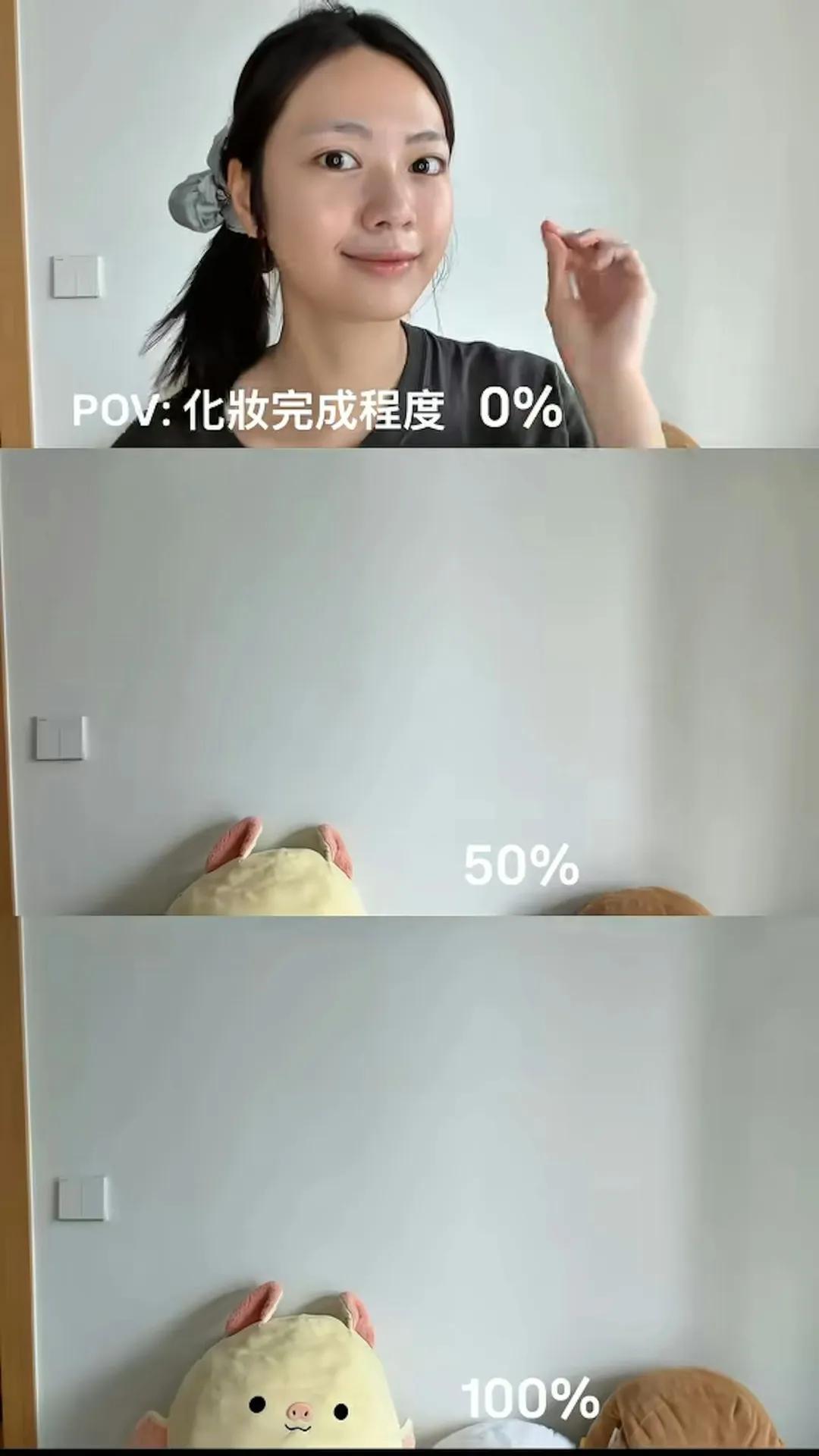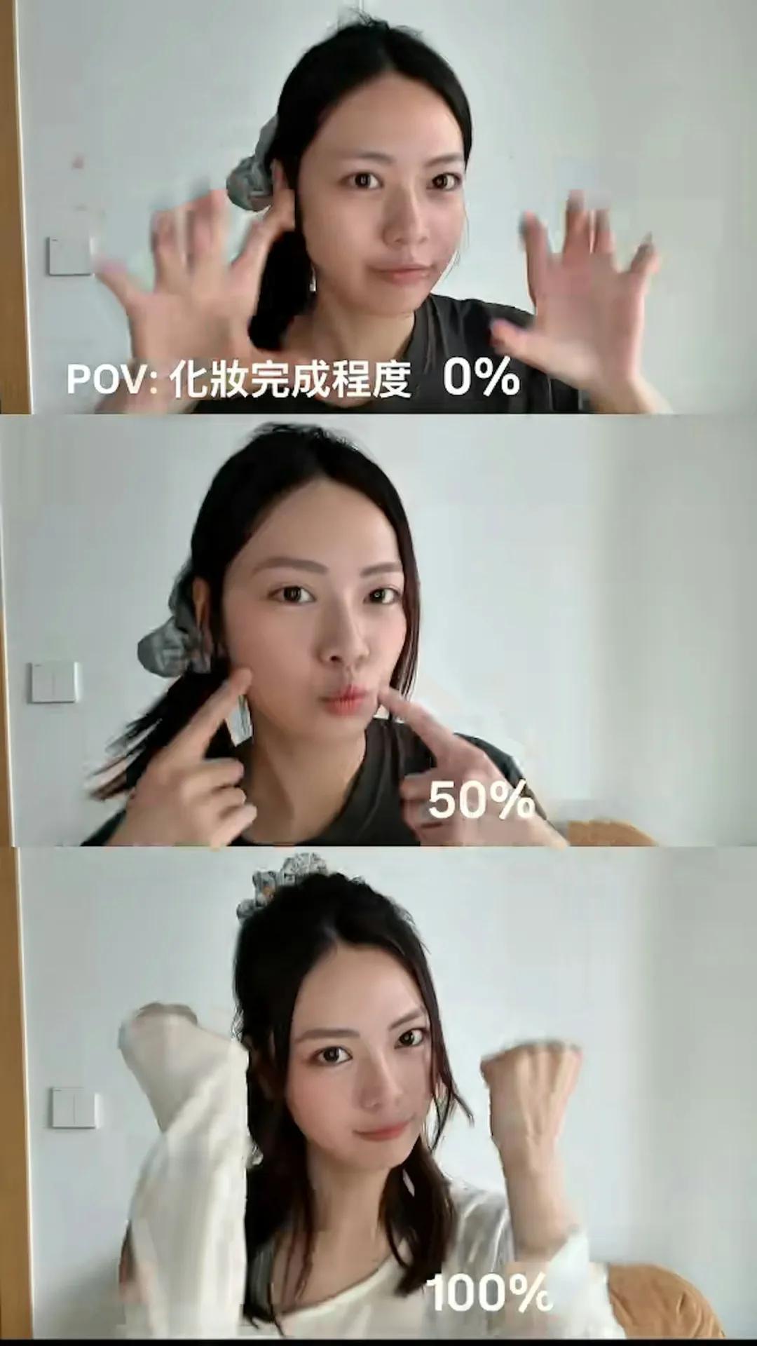 素颜出镜的她完全不怕以真面目示人,让大家看到她最真实自然的一面。视频分成三格,最上面一格是0%化妆,中间一格是50%化妆,最下面一格是100%化妆,三个阶段之间的对比还挺明显的,能清楚看到素颜与化完全妆的区别,化了妆确实更加漂亮。